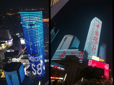 | 南京燈光秀廣告媒體位置 (南京中心、南京國際金融中心、南京國貿) 南京地標廣告媒體規格: 12萬方平方米 亮屏時間 19:15~21:15(與公益廣告輪播) 有效接觸視距 1000m以上 覆蓋人車流量 200萬人次/日 |
