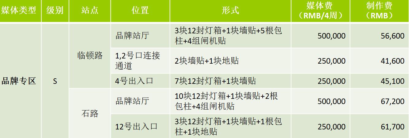 | 地鐵12封燈箱加安全門貼 媒體類型 站臺12封燈箱三聯(lián)裝加屏蔽門貼 S:媒體費(RMB/4周/站):220,000元 A++:媒體費(RMB/4周/站):160,000 A+:媒體費(RMB/4周/站):120,000 12封燈箱每塊950元,屏蔽門貼面積根據(jù)所選廣告發(fā)布位置的實際面積計算制作費 |