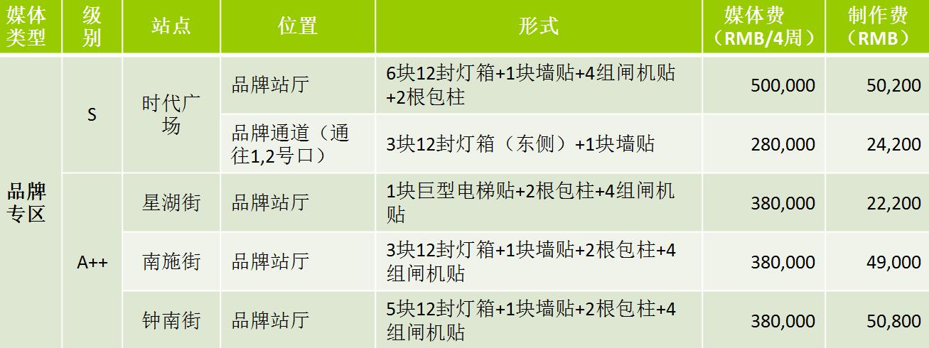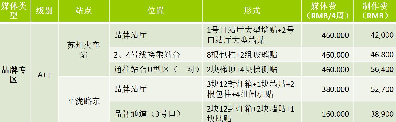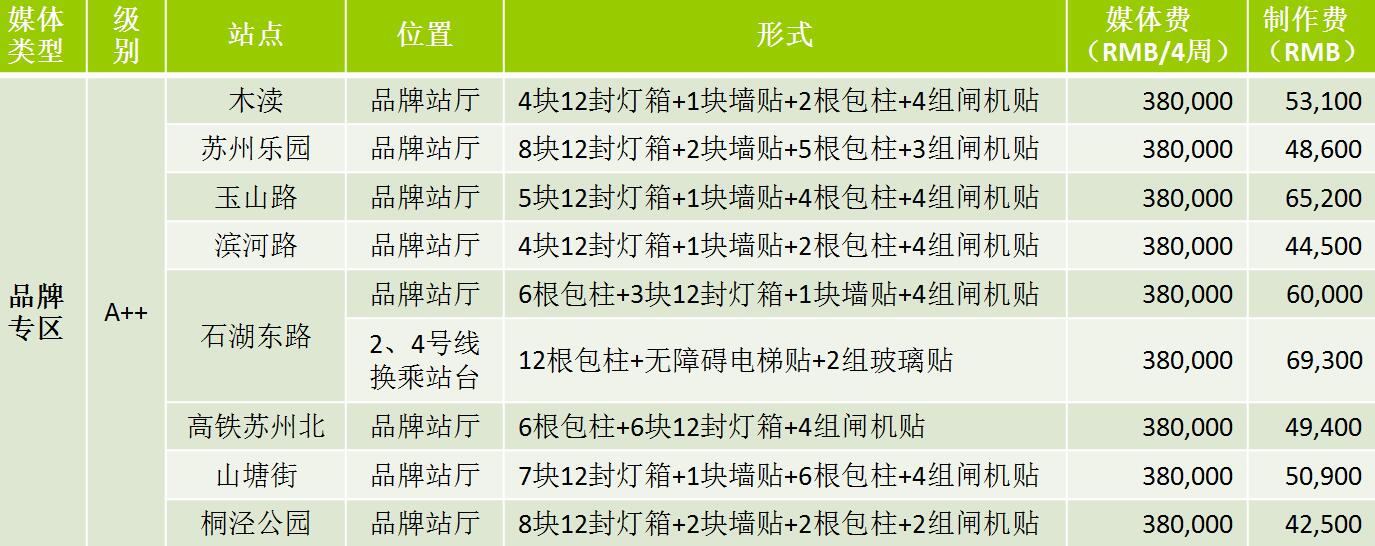 | 蘇州地鐵12封燈箱 級別 S:媒體費(RMB/4周/站) 72,000元 A++:媒體費(RMB/4周/站)58000元 A+:媒體費(RMB/4周/站)35000元 A:媒體費(RMB/4周/站)28000元 制作費:950元 ? |