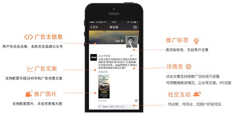 朋友圈廣告將會通過微信廣告系統進行投放和管理,廣告本身內容將基于微信公眾賬號生態體系,以類似朋友的原創內容形式進行展現,在基于微信用戶畫像進行定向的同時,依托關系鏈進行互動傳播。