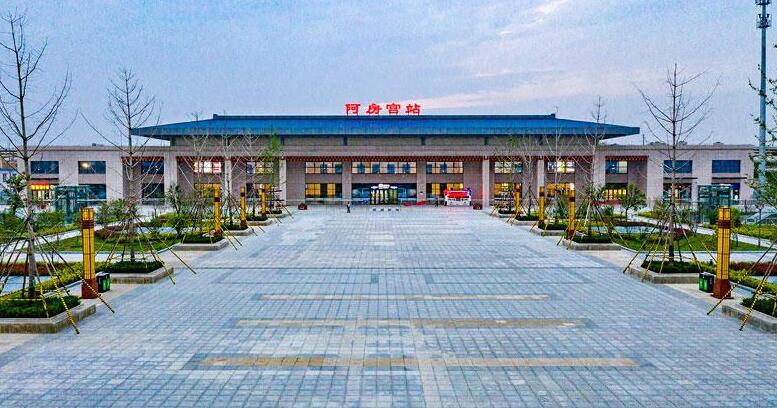 阿房宮站是西成客專自西安北站引出后的第一站,位于西安市長安區南陶莊村。位于西咸新區灃東新城大西安中央商務區西側,灃河東岸豐鎬大道旁,距離未來大西安灃東CBD核心區僅3公里(直線距離1.5公里),東距秦阿房宮遺址6.5公里(直線4.5公里),車站建筑遵循了秦漢建筑特征,古今相容,整體氣魄恢宏。