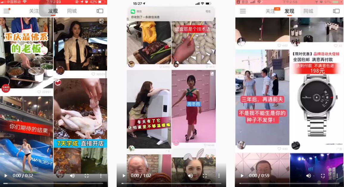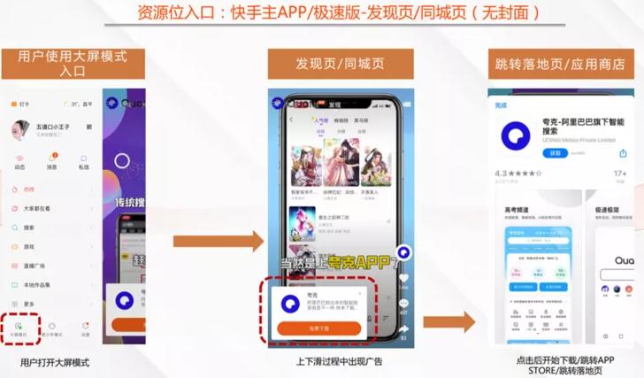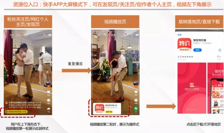 快手APP信息流廣告位在發(fā)現(xiàn)頁第五/六位,短視頻播放過程中可點擊下方行為按鈕,到達落地頁、淘寶APP,或者跳轉(zhuǎn)到應用市場。
