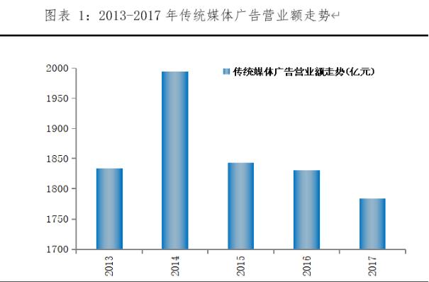 各企業(yè)對(duì)廣告投放也不再停留傳統(tǒng)的廣告投放模式,而是尋找用戶心理訴求,打造個(gè)性化廣告投放效果。由國(guó)家工商總局統(tǒng)計(jì)數(shù)據(jù),我國(guó)傳統(tǒng)媒體的廣告收入從2013年開(kāi)始出現(xiàn)斷崖式下滑。2013年,電視廣告收入為1101.1億元,同比下滑2.76%;報(bào)紙廣告收入為504.7億元,同比下滑9.16%,四大傳統(tǒng)媒體廣告收入之和為1834.18億元,同比下滑4.09%。雖然2014年轉(zhuǎn)為正增長(zhǎng),傳統(tǒng)廣告媒體營(yíng)業(yè)額上升至1994.63億元,但在這之后又開(kāi)始了連續(xù)三年下滑。