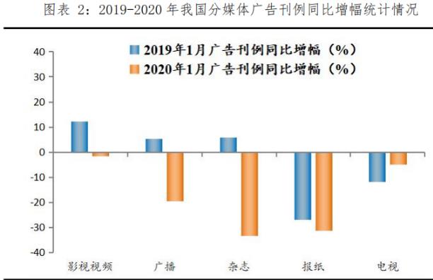 目前,分媒體來(lái)看,傳統(tǒng)廣告媒介主要包括影視媒體、報(bào)紙媒體、雜志、廣播和電視等。2020年1月,報(bào)紙、雜志、廣播等較為傳統(tǒng)的廣告媒介刊例下降幅度較大,報(bào)紙、雜志等紙媒下降了將近30%以上,廣播媒介與電視下降了19.5%和4.9%。整體而言,傳統(tǒng)媒體廣告刊例花費(fèi)呈下降趨勢(shì),報(bào)紙、雜志等紙媒首當(dāng)其沖,其次廣播媒介,最后電視及影視媒介。