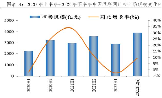 8月2日QuestMobile發(fā)布《2022互聯(lián)網(wǎng)廣告市場(chǎng)半年大報(bào)告》顯示(圖表4),2020年上半年-2022年下半年中國(guó)互聯(lián)網(wǎng)廣告市場(chǎng)規(guī)模波動(dòng)變化明顯,今年上半年中國(guó)互聯(lián)網(wǎng)廣告市場(chǎng)規(guī)模為2903.6億元,同比降低2.3%。一般下半年廣告規(guī)模呈良好態(tài)勢(shì),整體來(lái)看2022年下半年互聯(lián)網(wǎng)廣告市場(chǎng)規(guī)模略有增加,同比增長(zhǎng)9.4%。